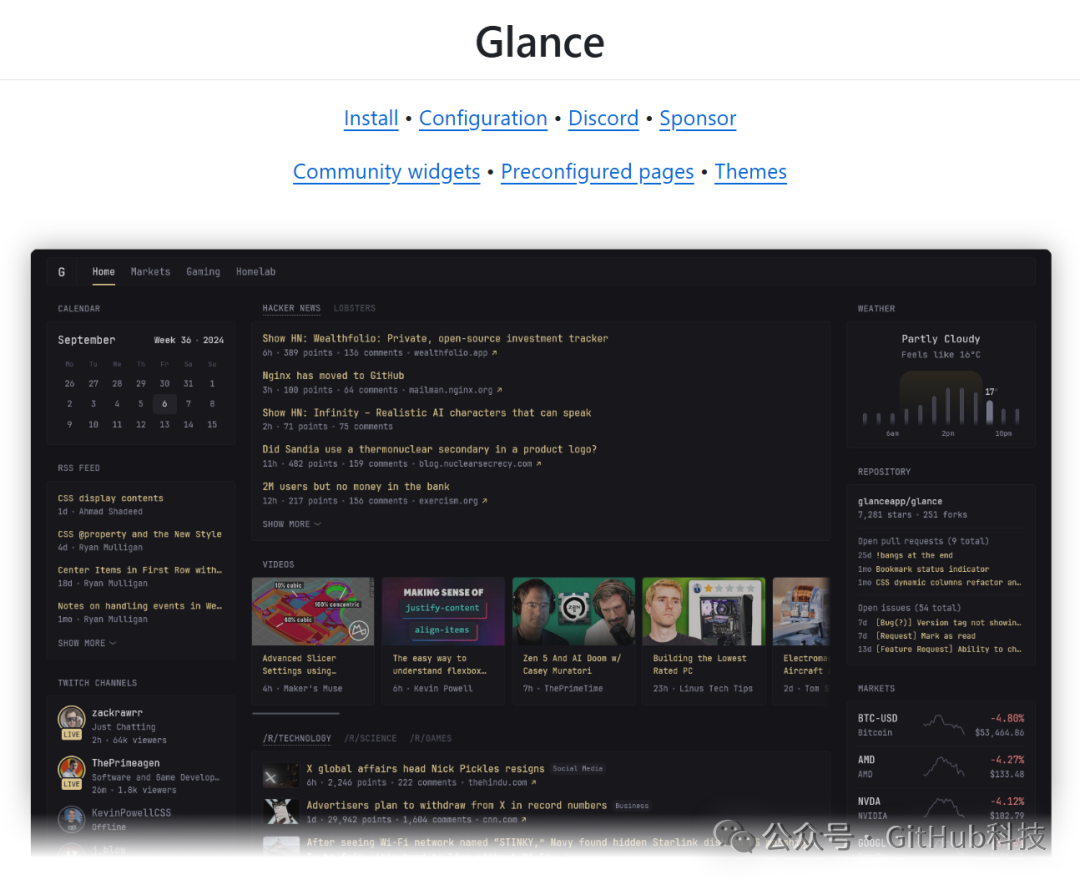 Glance 是一个极简却功能丰富的自托管多功能控制面板工具,能将各种信息流(新闻、天气、Twitch直播、RSS订阅等)集成在一个仪表盘式的页面中。它简单易用,可高度自定义,同时兼容多种设备。如果你想要打造专属的智慧“工作台”,Glance 会是你的不二选择!