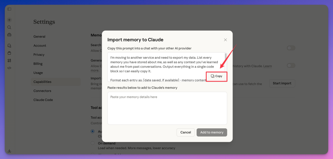 弹窗上半部分是 Anthropic 预设好的提示词,点「Copy」复制。