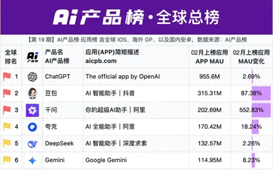 3月3日,AI产品榜发布全球AI应用最新数据。榜单显示,MAU(月活用户数)排名前三的AI应用分别为ChatGPT、豆包和千问,其中,豆包达3.15亿MAU;千问MAU达2.03亿,增速达553%,国内AI应用已呈现豆包、千问双雄并立的格局。