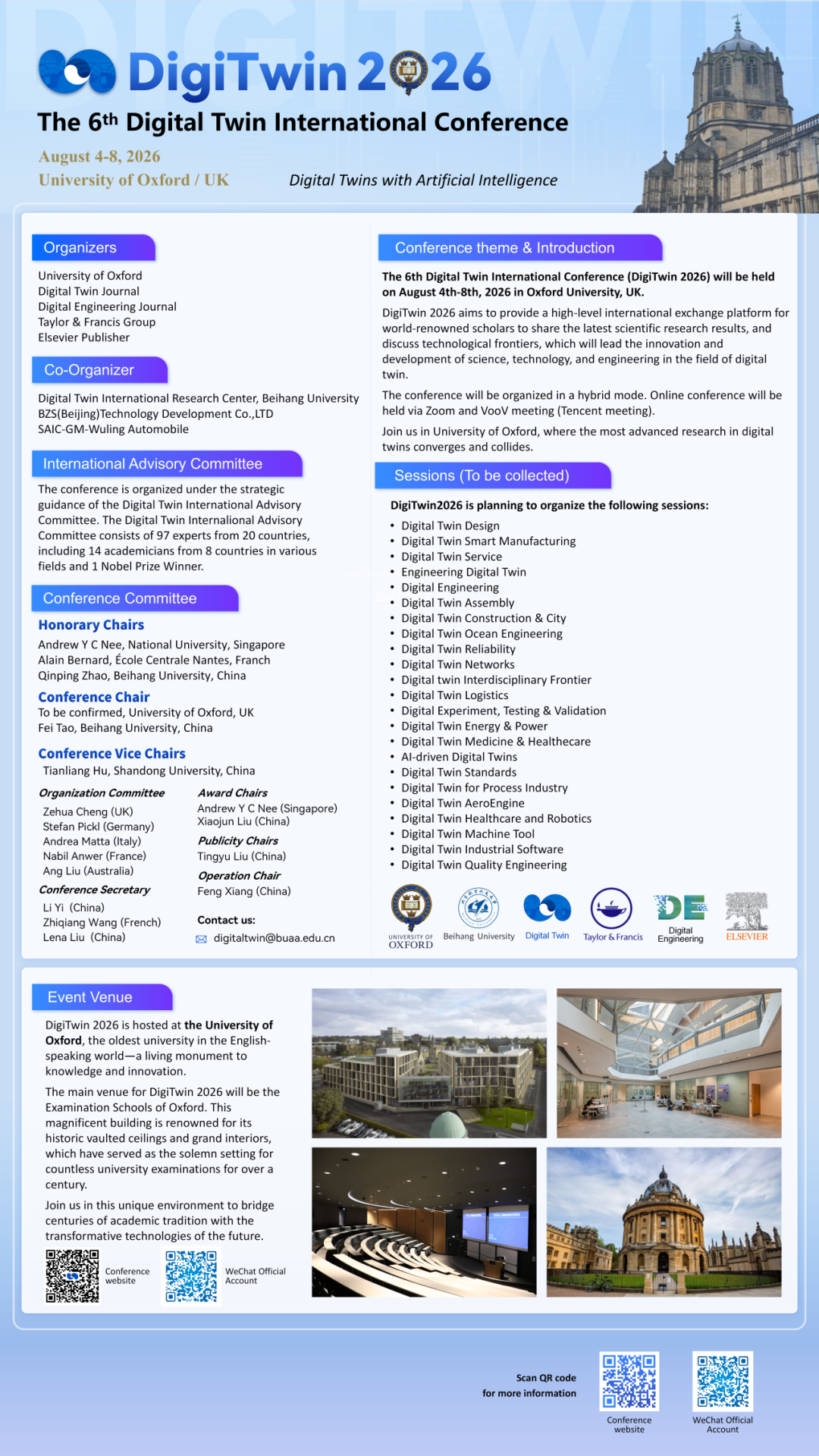 第六届数字孪生国际会议(DigiTwin 2026)将于2026年8月4-8日,在英国牛津大学举行。