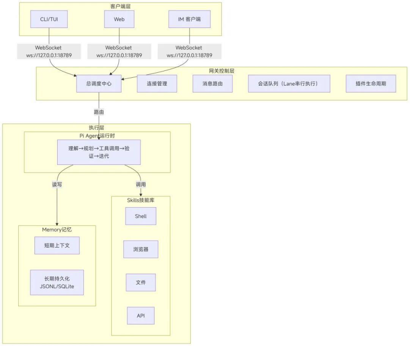 整体架构可概括为:OpenClaw = 大模型推理内核(大脑层) + Lobster智能执行循环(核心枢纽) + 多渠道聊天网关(入口层) + 可插拔技能生态(执行层) + Memory & State记忆模块(记忆层),五大模块各司其职、协同联动,构成完整的自主代理系统。