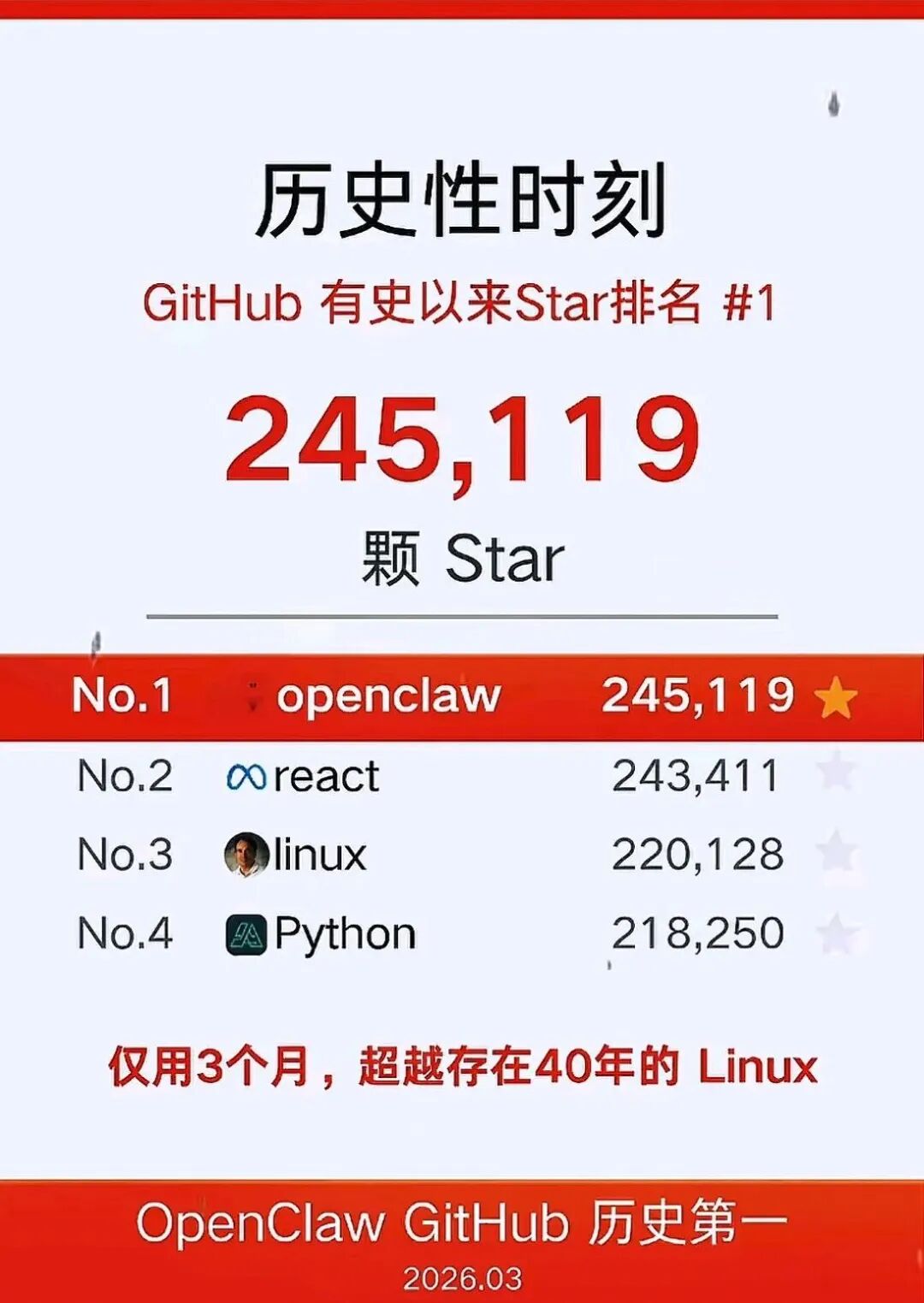 最近爆火的OpenClaw开源项目,正式超越React,成为GitHub上Star数最多的软件类项目。数字是24.9万,而React花了13年才积累到24万。OpenClaw从发布到登顶,用了大约4个月。