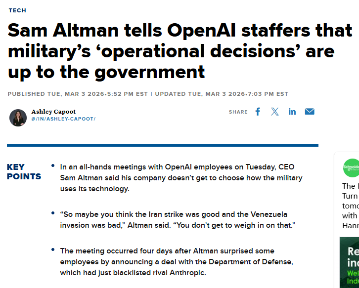 萨姆·奥特曼告诉 OpenAI 员工,军方的“作战决策”由政府决定
