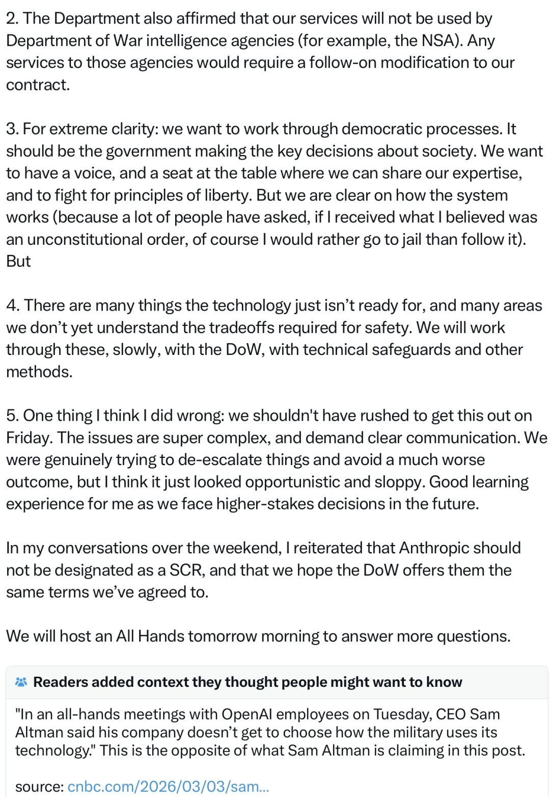 反思公关策略与声援竞争对手: 奥特曼坦诚,选择在周五仓促公布与军方的合作是一个错误决定。此举本意是为了缓和局势,结果却适得其反,显得草率且投机取巧。值得注意的是,奥特曼透露他已在周末的会谈中为竞争对手发声,强调不应将 Anthropic 认定为安全风险,并呼吁战争部能向 Anthropic 提供相同的公平条款。
