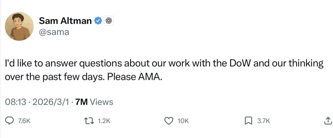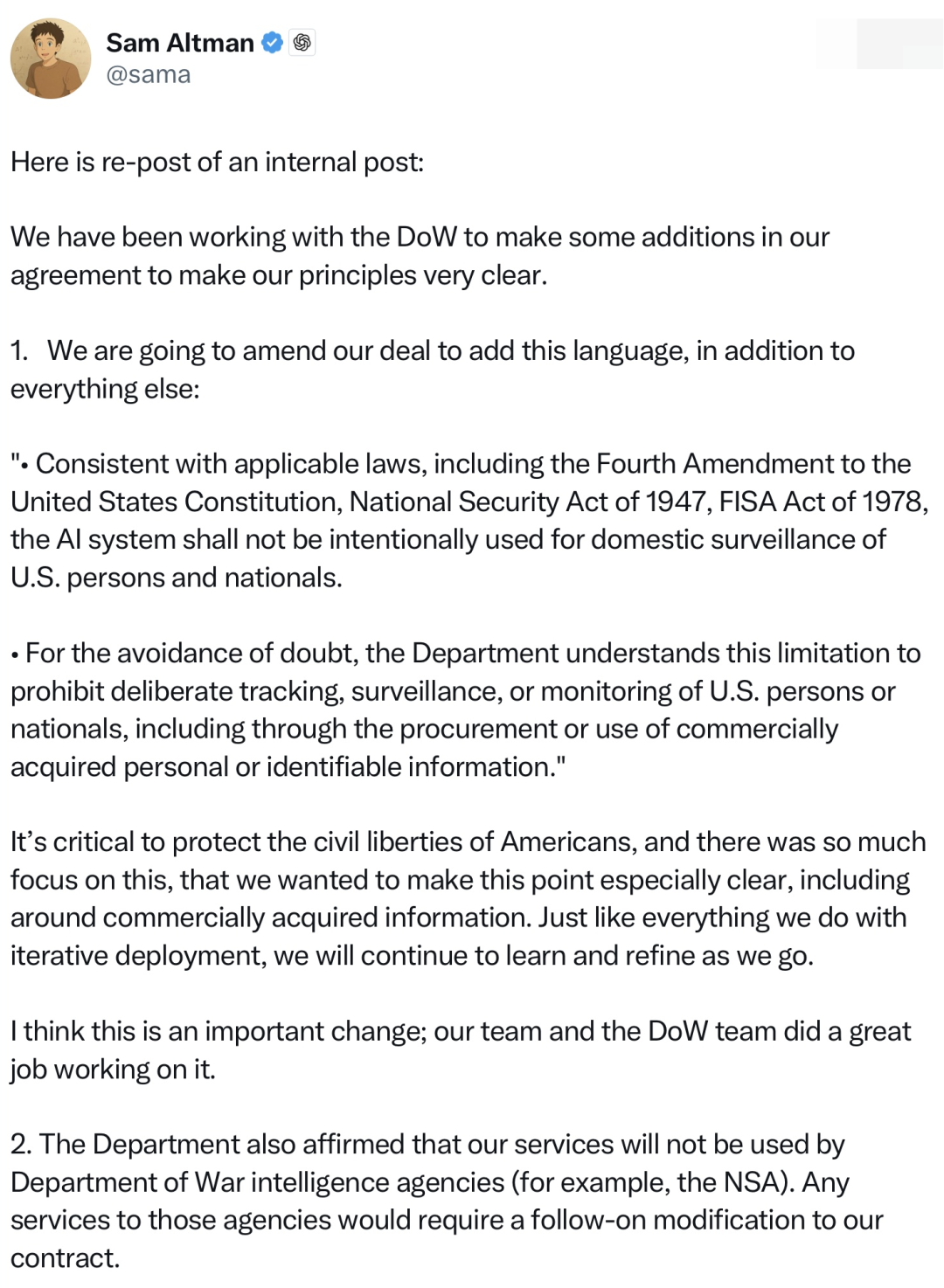 忙着在自己的社交平台上,跟网友们解释OpenAI与军方合作的“某些细节”。在Anthropic因为拒绝让步丢掉了与五角大楼的合同,但又“得到了民心”的同时,OpenAI的处境变得有点微妙。他洋洋洒洒地说了那么多,主要是想表达OpenAI 针对其与美国战争部(DoW)的合作协议进行了重要更新与补充说明。为了打消外界疑虑并明确公司底线,OpenAI 团队与战争部共同在合同中增加了严格的限制条款。以下是本次声明的核心资讯要点:划定国内监视“禁区”: 协议新增条款明文规定,严格遵循美国宪法第四修正案及相关国家安全法律,OpenAI 的人工智能系统绝不会被蓄意用于对美国公民及国民的国内监控或追踪。该限制不仅涵盖直接的监视行为,也明确堵住了“通过采购商业数据进行间接监控”的漏洞,凸显了公司对保护公民自由的重视。