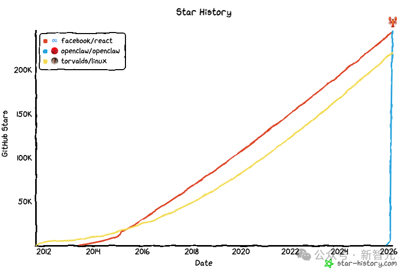 更令人瞩目的是,OpenClaw的数据是以近乎垂直的直线飞速飙升的,爆发后仅仅用了今年前两个月,就超越了如Linux和React等众多持续更新了十多年的超大型基建项目!