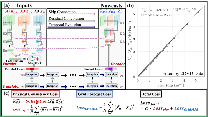 在此基础之上,团队潘翔博士进一步研发了新一代强对流临近预报模型——FURECast。该研究首次将三维双偏振雷达数据(ZH, ZDR, KDP)与物理自洽性约束引入深度学习框架。模型通过编码-演变-解码结构,有效提取1km、3km和7km高度层的风暴垂直结构信息,捕捉上升气流、风切变等关键动力特征。更重要的是,研究基于雨滴谱数据重新拟合了双偏振变量间的自洽性关系,并将其作为物理损失函数加入模型训练,确保预报结果不仅在统计上准确,更在微物理过程上符合物理规律(图1)。
