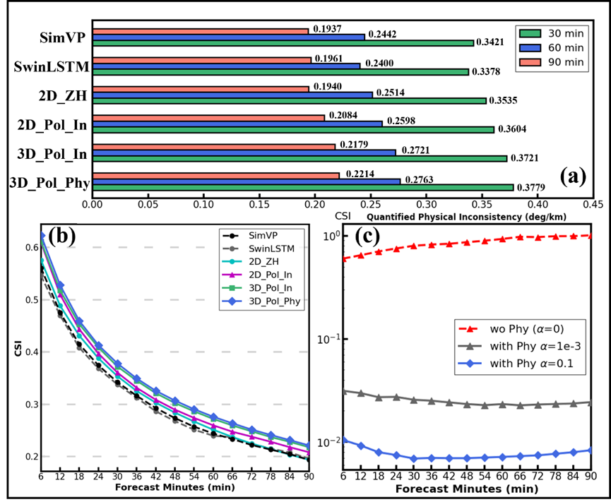 图2. (a)多组模型35dBZ强对流预报CSI评分结果;(b)多组模型强对流预报评分随时间变化;(c)物理一致性偏差评估结果