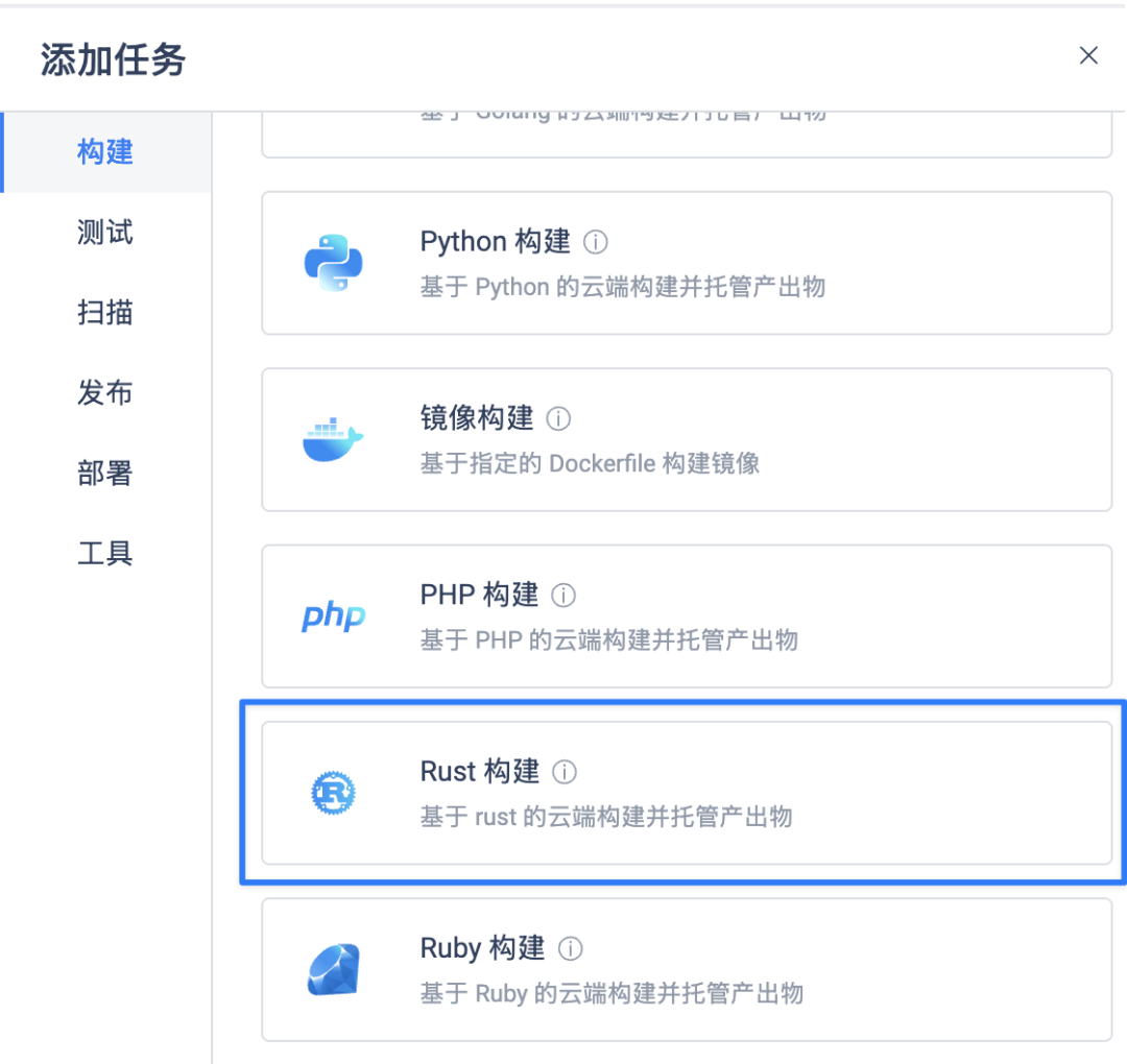 一站式支持 Java、Go、Python、Node、PHP、.NET、Rust 等语言,满足微服务架构下不同技术栈的统一流水线管理。