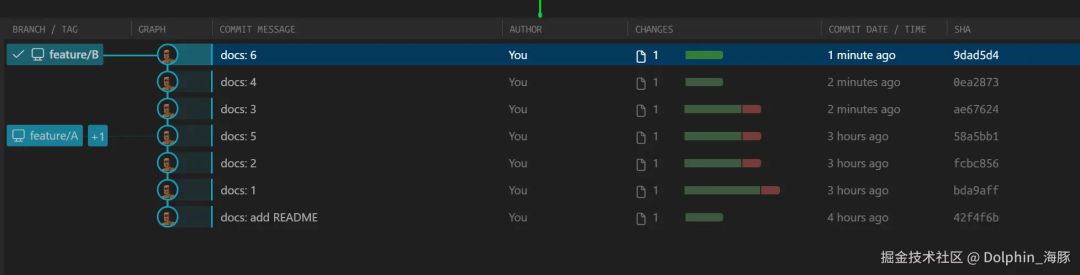 可以看到 最终的 git 记录成一条直线了,看着确实顺眼不少,并且你的分支所有提交都会提前,你也不会产生 合并 的 mr 节点,但是你分支上原本的 commit hash (docs:3, dosc: 4, dosc: 6)会发生变化