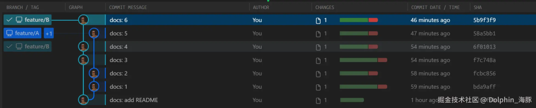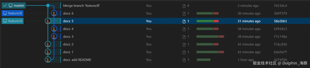 feature/B 准备合入 master 时,master 最新的提交却是 feature/A 的 dosc: 5
