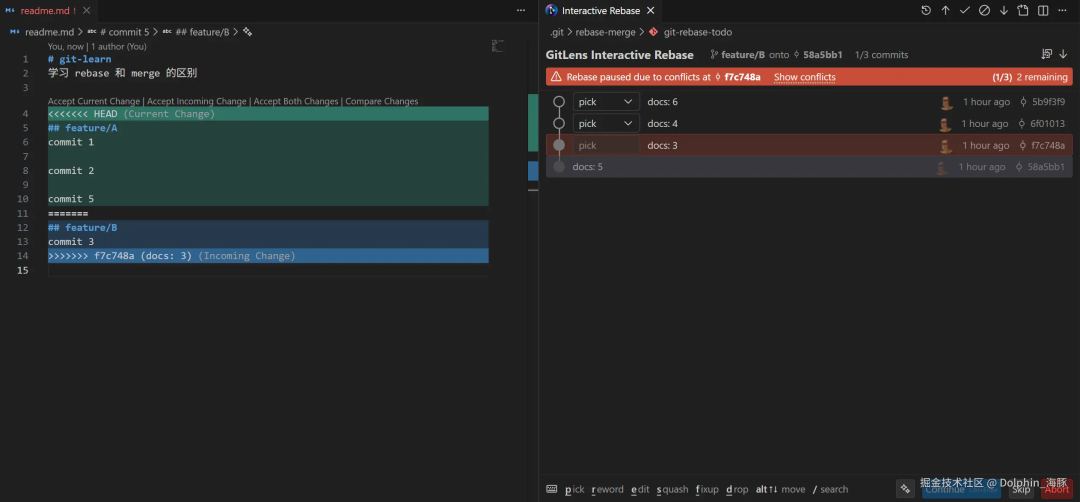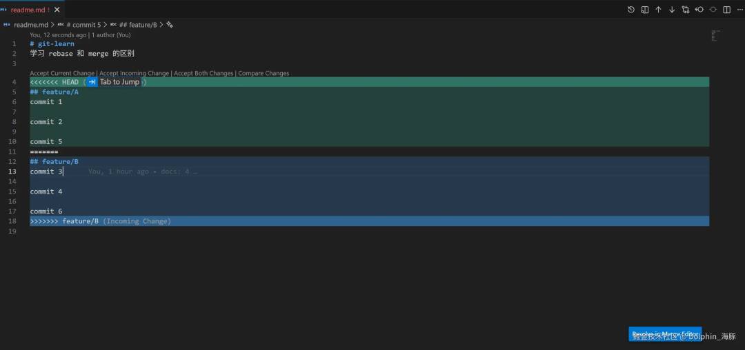 可以看到 vscode 编辑器让我去解决冲突,这还是第一个