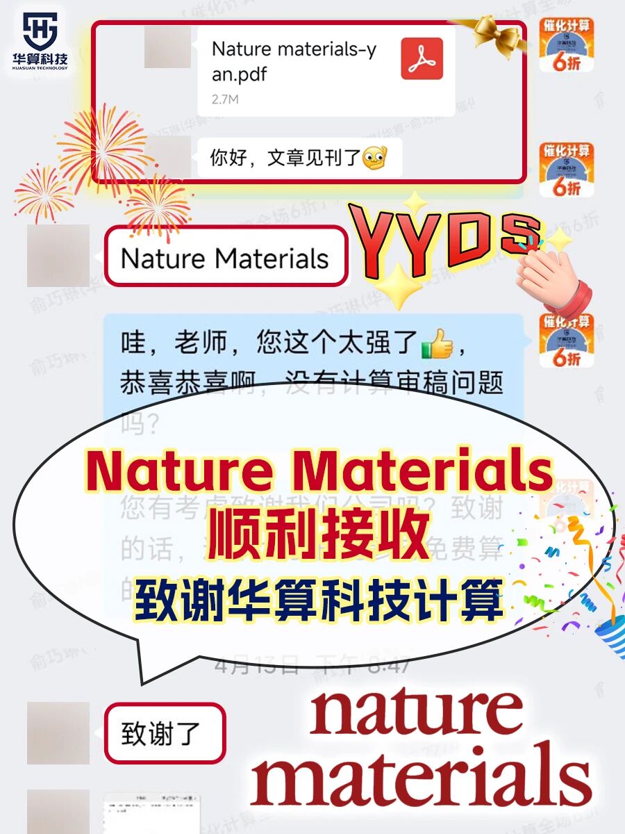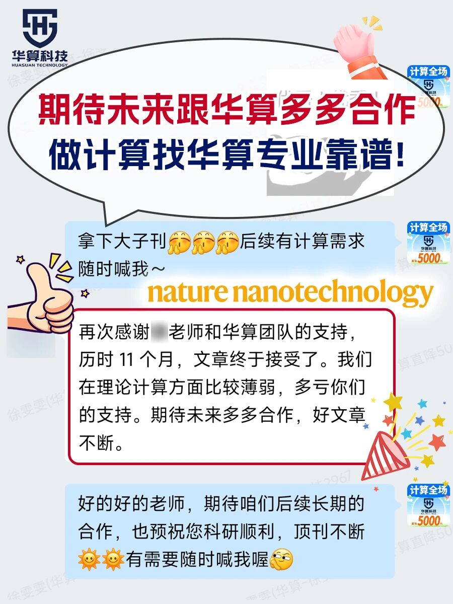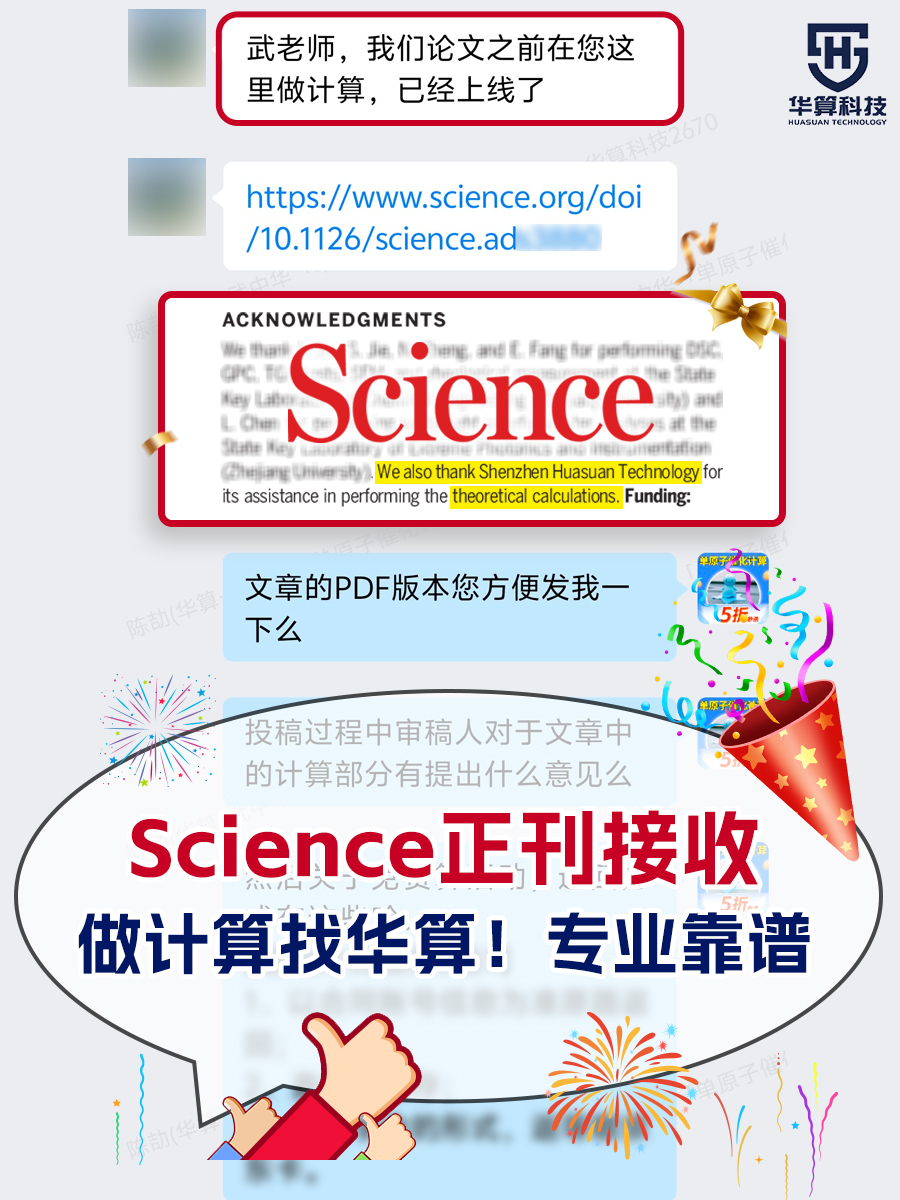 华算科技提供理论计算服务,累计助力超过50000+成功案例在:Nature系列、Science系列、JACS、Angew、PNAS、AM系列等国际顶刊顺利发表。其中