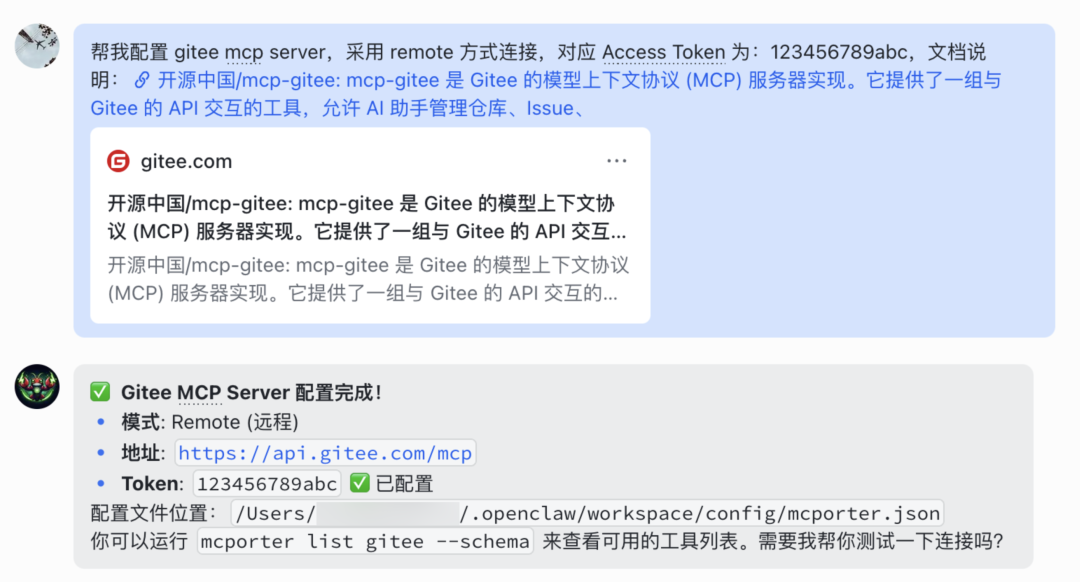 安装 mcporter 后,在任意可与 OpenClaw 交互的客户端输入如下指令,OpenClaw 会自行完成 Gitee MCP Server 的配置: