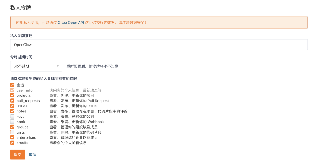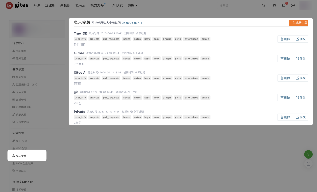 在 Gitee 官网中点击右上角头像,选择设置,进入私人令牌页面,新建一个私人令牌: