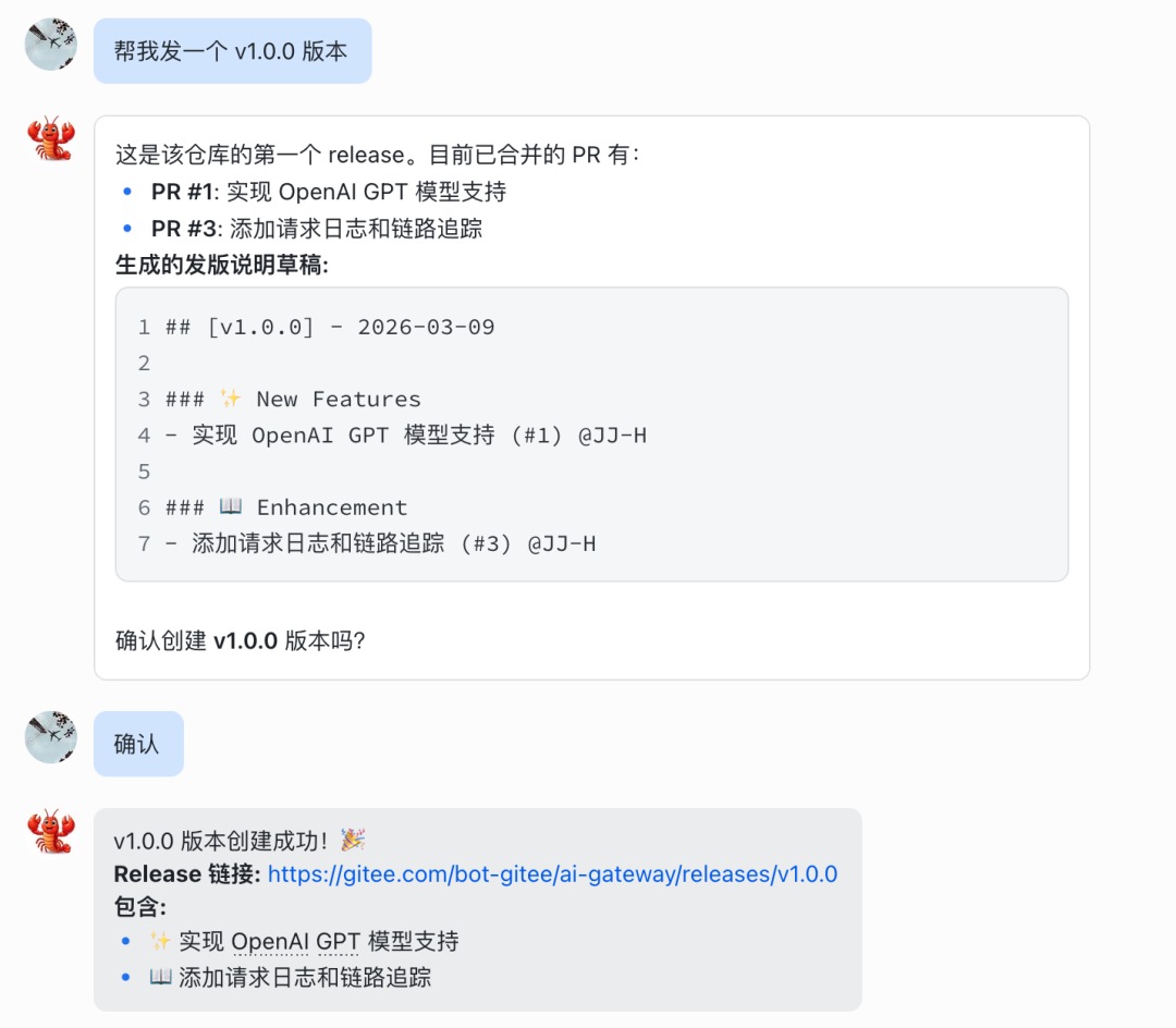 Gitee 小龙虾将触发create-releaseskill: