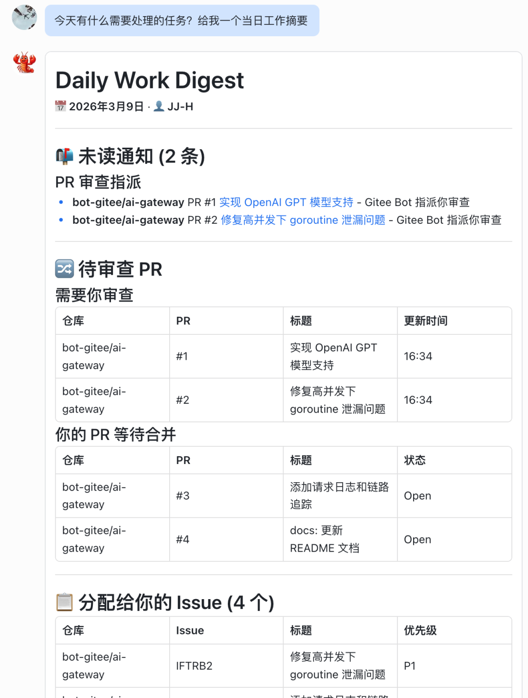 你可以问:今天有什么需要处理的 PR?给我一个当日工作摘要。