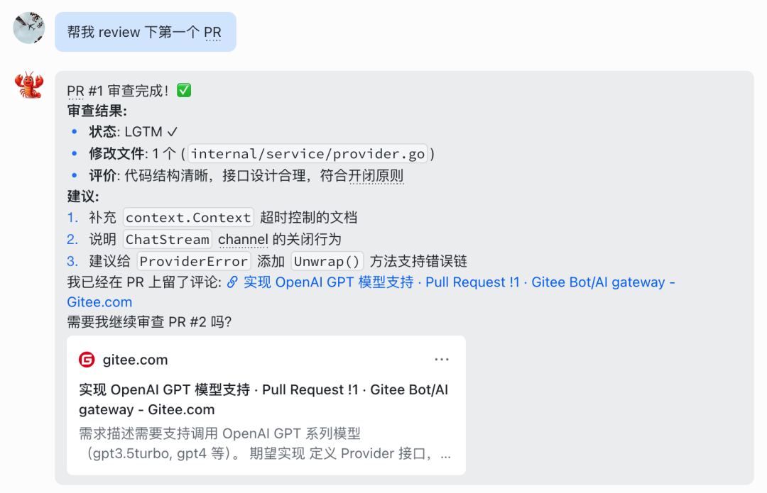 现在,你可以让你的小龙虾帮你在 Gitee 上干活了:比如你说「帮我 review 这个 PR」,它会真的拉取 diff、分析代码、把 Review 评论发到 Gitee 上。