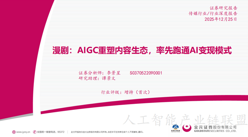 金元证券发布传媒行业深度报告,首次覆盖并给予“增持”评级。报告指出,在AI应用遍地开花却普遍面临变现难题的当下,漫剧(AIGC生成式微短剧)凭借其低成本、高效率、强视觉表现力,已率先跑通商业闭环,成为AI变现的黄金赛道。以下为报告核心内容精编。