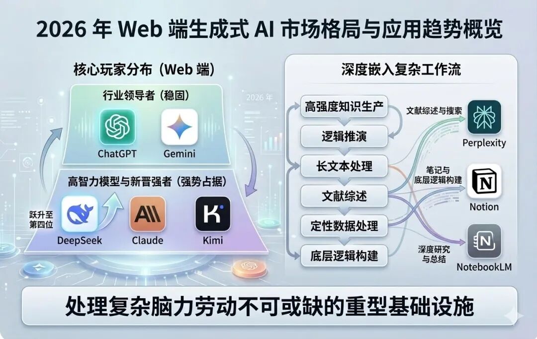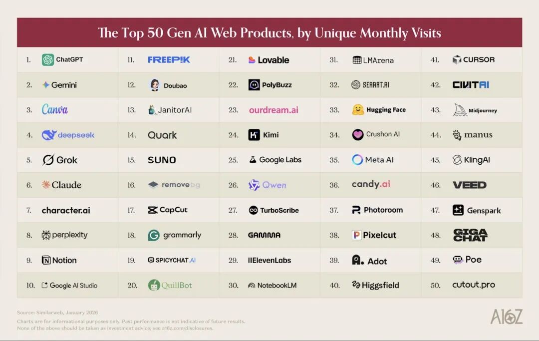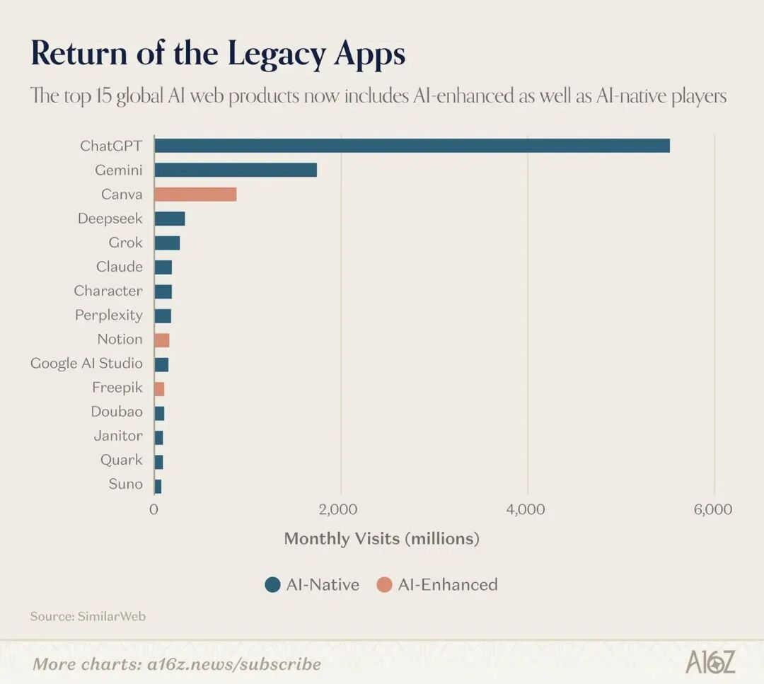 前两年有一种论调:原生AI创业公司将彻底颠覆现有的软件巨头。但2026年的数据打碎了这个神话。在月活前15的Web应用中,我们看到的不只有ChatGPT、DeepSeek这样的“AI原生”玩家,像Canva、Notion甚至Freepik这样的“AI增强”老牌劲旅同样占据高位。