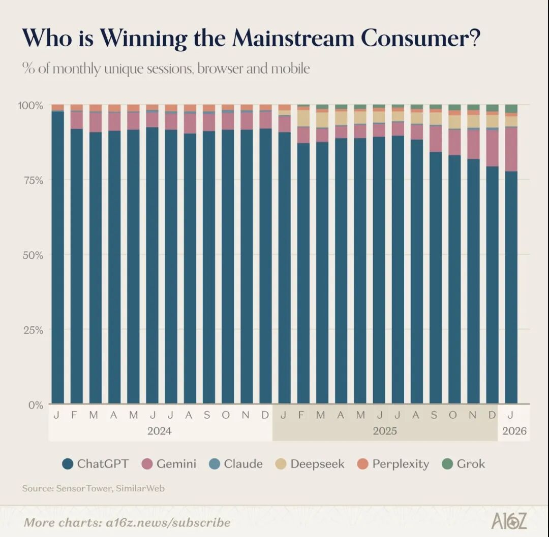 如果把时间线拉长到过去两年,大模型王座的争夺战比我们想象的还要激烈。从这张2024到2026年的主流消费者市场份额演变图中,我们可以得出三个关键结论: