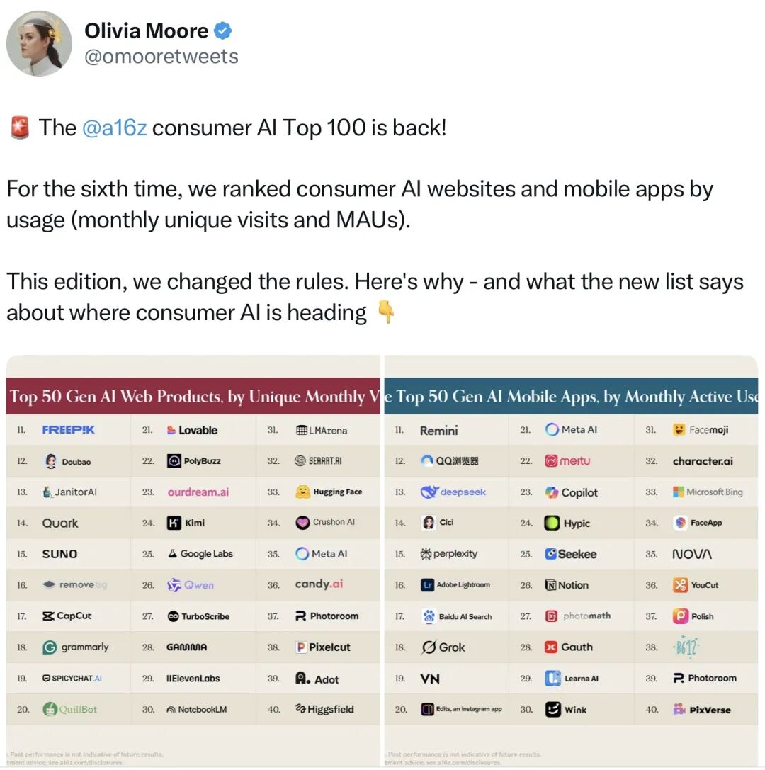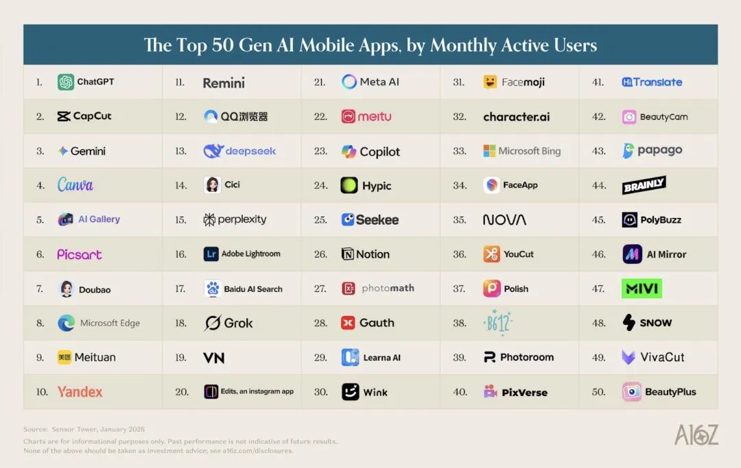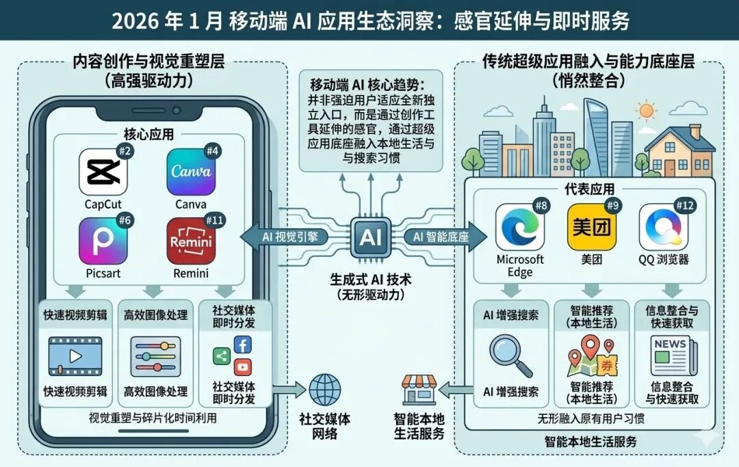 首先聚焦Web端。尽管ChatGPT与Gemini的领先地位依然稳固,但最引人注目的变化莫过于DeepSeek跃升至第四位,以及Claude、Kimi等高智力模型的强势占位。这一趋势表明,在桌面端场景中,用户正将AI视为进行高强度知识生产、逻辑推演和长文本处理的核心引擎。诸如Perplexity、Notion乃至NotebookLM的登榜,进一步反映出学术界和知识工作者已将AI深度嵌入到文献综述、定性数据处理以及底层逻辑构建的复杂工作流中。显然,Web端正在演变为处理重度脑力劳动不可或缺的基础设施。相较之下,移动端榜单则勾勒出另外一番“感官延伸与即时服务”的生态图景。CapCut(剪映)高居第二,紧随其后的是Canva、Picsart和Remini,这清晰地表明:在手机屏幕上,AI的核心驱动力在于视觉重塑与碎片化的内容创作。移动端用户更倾向于利用AI进行快速的图像处理、视频剪辑以及跨社交媒体的即时分发。与此同时,美团、QQ浏览器以及Edge等传统超级应用的入榜,则揭示了移动端AI的另一重逻辑——它更多是作为一种无形的能力底座,悄然融进用户原有的本地生活与搜索习惯中,而非强迫用户去适应一个全新的独立入口。另一个极具社会学意义的观察切面,在于中国AI力量在底层大模型与前端应用层的双线爆发。DeepSeek在深度推理和代码能力上实现全球性突破,叠加豆包、通义千问在双端的高渗透率,实质上打破了以往由硅谷单极主导的技术叙事语境。这不仅仅标志着算力与算法的快速追赶,更体现了本土模型对特定用户痛点如长上下文处理能力与高性价比的调用成本的精准把握。