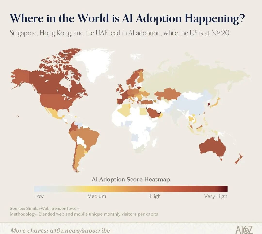 在全球AI渗透率方面:美国并非第一,亚洲与中东地区领跑。我们往往默认硅谷是AI的绝对中心,美国的AI普及率理应最高,但现实数据却给出了反直觉的答案。从全球AI采纳度热力图可以看出,真正将AI深度融入日常的“急先锋”其实是新加坡、中国香港以及阿联酋;相比之下,美国在整体人均访问量上仅排在第20位。这有力地说明,技术的发源地并不等同于技术的大规模应用地,反而是那些高密度、快节奏的经济体,对AI这种能够极大提升生产效率的革命性工具展现出了极其饥渴的接纳度。
