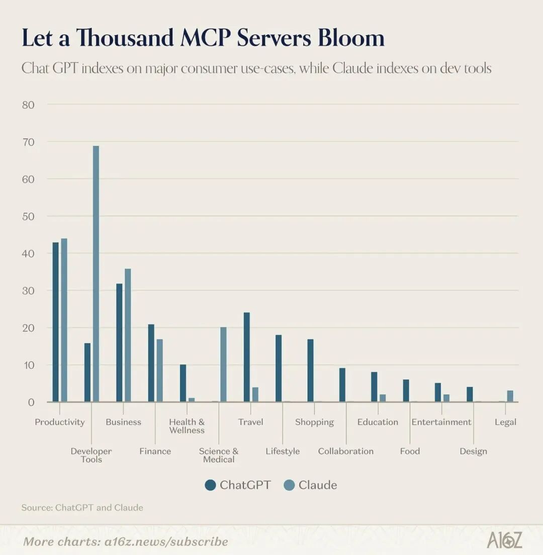 场景的分野:ChatGPT管生活,Claude写代码。即便是同等级别的顶尖模型,用户的实际使用诉求也出现了极度的两极分化。在对不同MCP服务器使用场景的统计中: