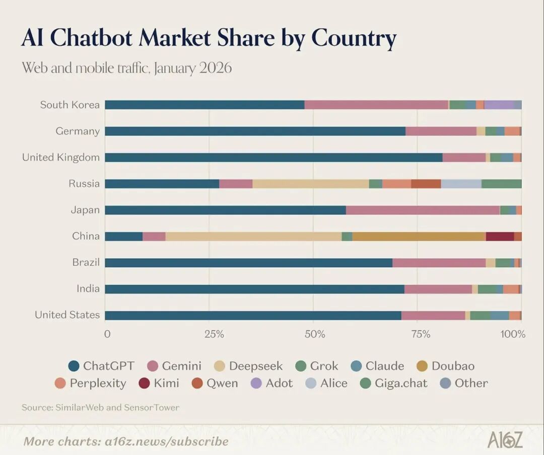 最引人注目的当属中国市场。在独特的网络生态下,中国已经孵化出了一套完全独立且极其繁荣的AI应用矩阵。图中清晰地显示,DeepSeek拿下了惊人的市场份额,结合移动端表现强劲的Doubao,以及Kimi、Qwen,中国本土模型已经实现了对工作流和移动社交的全面接管。同样,俄罗斯市场也呈现出显著的本土化特征如Yandex生态与Giga.chat。全球AI正在形成“多极化”的格局。