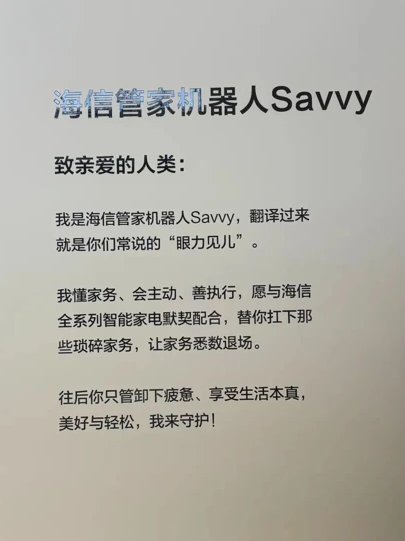 海信的智能管家机器人Savvy,最大的卖点是“有眼力见”,会主动做家务。换句话说,就是“眼里有活,执行迅速”,不用等主人下指令,就把家务做了。