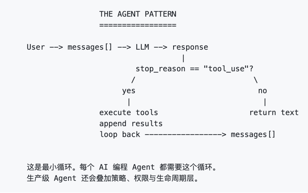 这个项目的核心洞察非常犀利:所有 AI 编程 Agent 的底层都是同一个循环。用户发消息给模型,模型决定要不要调用工具,调用了就执行,把结果喂回去,继续循环,直到模型觉得任务完成了。