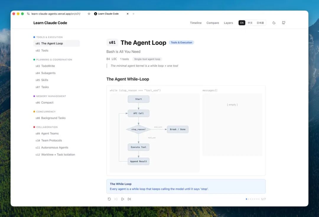 而且还配了一个交互式 Web 平台(learn-claude-agents.vercel.app),有步骤图解、源码查看器和文档,支持英文、中文、日文三种语言。