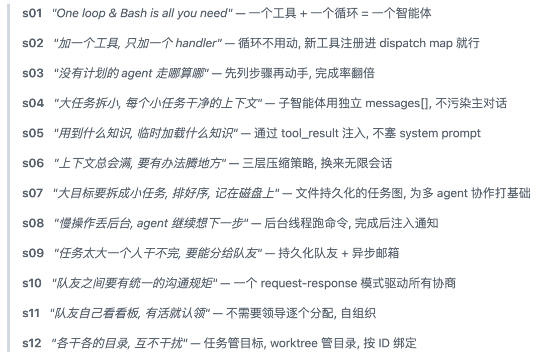 Learn Claude Code 最吸引人的地方,就是它的学习路径设计。12 节课,每节课只解决一个问题,每节课都有一句核心 motto,整个过程逻辑清晰,循序渐进。