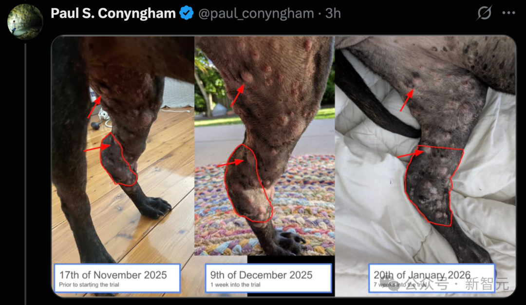 短短数周,Rosie在接受定制的mRNA 癌症疫苗治疗后,后腿关节上那个网球大小的肿瘤竟「缩小了一半」!