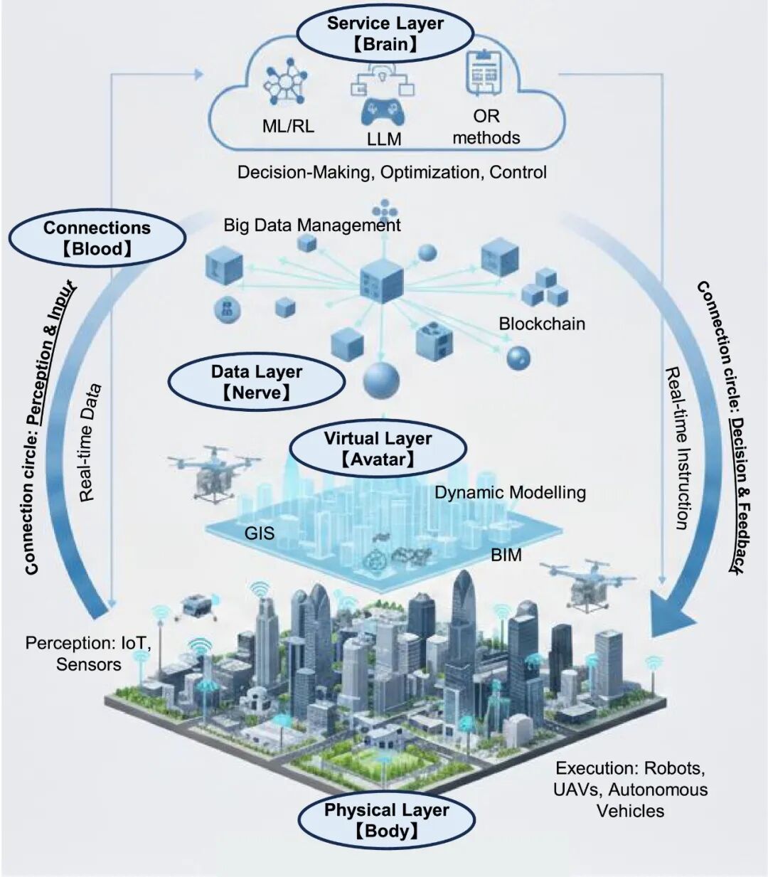 数字孪生正成为推动城市数字化转型、智能决策与可持续发展的关键支撑技术。本文围绕交通、能源、环境监测、公共安全和城市治理等典型场景,系统总结了数字孪生在智慧城市中的应用进展与五层技术框架,分析了数据安全、系统互操作性、跨部门协同、高建设成本及复合型人才短缺等现实瓶颈,并从技术层优化与目标导向融合两个维度提出未来研究重点,为智慧城市与可持续发展深度协同提供了清晰路径。
