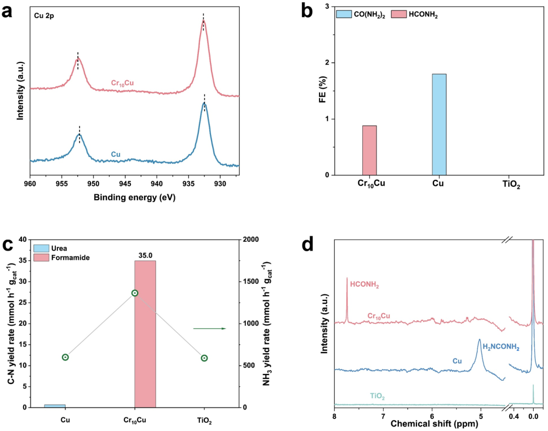 3)共还原CO与NO2−时,Cr掺杂Cu催化剂生成甲酰胺的产速为35.0 mmol h–1 g–1,与过去报道相比催化剂性能良好。