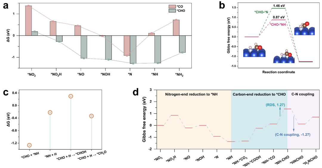 1)比较偶联前后发现,*CO中C原子的正电性最低,最容易和质子结合生成*CHO。*CHO与*NH最容易偶联,从而可生成甲酰胺。