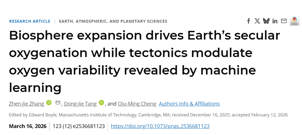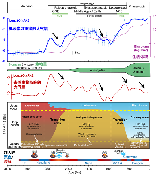 近日,PNAS发表论文,基于沉积黄铁矿微量元素记录并结合机器学习方法重建了35亿年来的大气氧演化过程,揭示生物主导长期氧化而构造调制短期波动,为利用黄铁矿示踪古氧化还原环境及理解地球宜居性演化提供了新的定量框架。 题目:Biosphere expansion drives Earth’s secular oxygenation while tectonics modulate oxygen variability revealed by machine learning作者:Zhen-Jie Zhang*(张振杰);Dong-Jie Tang(汤冬杰);Qiu-Ming Cheng(成秋明)期刊:Proceedings of the National Academy of Sciences (PNAS)摘要:大气氧含量的上升从根本上改变了地球表层环境,并促成了复杂生命的演化。然而,驱动大气氧长期波动的过程仍缺乏清晰认识,这在一定程度上源于代用指标分辨率和时间覆盖范围的限制。沉积黄铁矿中的微量元素浓度为重建古海洋氧化还原状态及其与大气氧水平之间的联系提供了可靠记录。本文整合了跨越35亿年的黄铁矿颗粒高分辨率地球化学数据,并结合机器学习方法重建大气氧演化历史。研究识别出两类具有一致变化特征的微量元素组合,分别代表氧化还原敏感过程和热液作用影响。结果表明,大气氧长期演化趋势与生物圈扩张密切耦合,而叠加其上的短期波动则主要受构造事件控制,包括超大陆的拼合与裂解。具体而言,主要的氧化事件即大氧化事件和新元古代氧化事件均与生物扩张密切相关。持续氧化阶段通常与大陆拼合时期相对应,这可能反映了风化作用增强、营养物质输入增加以及有机碳埋藏加强;而超大陆裂解阶段则常与较还原的环境相联系,可能与火山活动增强及生物圈净产氧降低有关。该重建结果不仅细化了地球氧化还原演化的时间动态,也揭示了生物生产力、构造过程、海洋化学及地球系统多圈层过程在塑造行星宜居性中的协同作用。这些发现为理解地球大气演化提供了综合框架,并为早期地球及其他宜居行星的环境变化研究提供了重要参考。机器学习大气氧反演结果及其与生物-构造的协调演化
