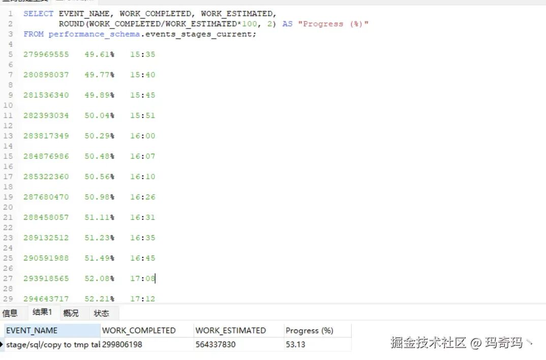 SELECT EVENT_NAME, WORK_COMPLETED, WORK_ESTIMATED, ROUND(WORK_COMPLETED/WORK_ESTIMATED*100, 2) AS "Progress (%)" FROM performance_schema.events_stages_current; 不查不知道,一查吓一跳, 跑了十几个小时居然还不到50%,而且还越跑越慢 。对比了一下测试环境和现网环境的 buffer_pool 等数据也是设置正常。