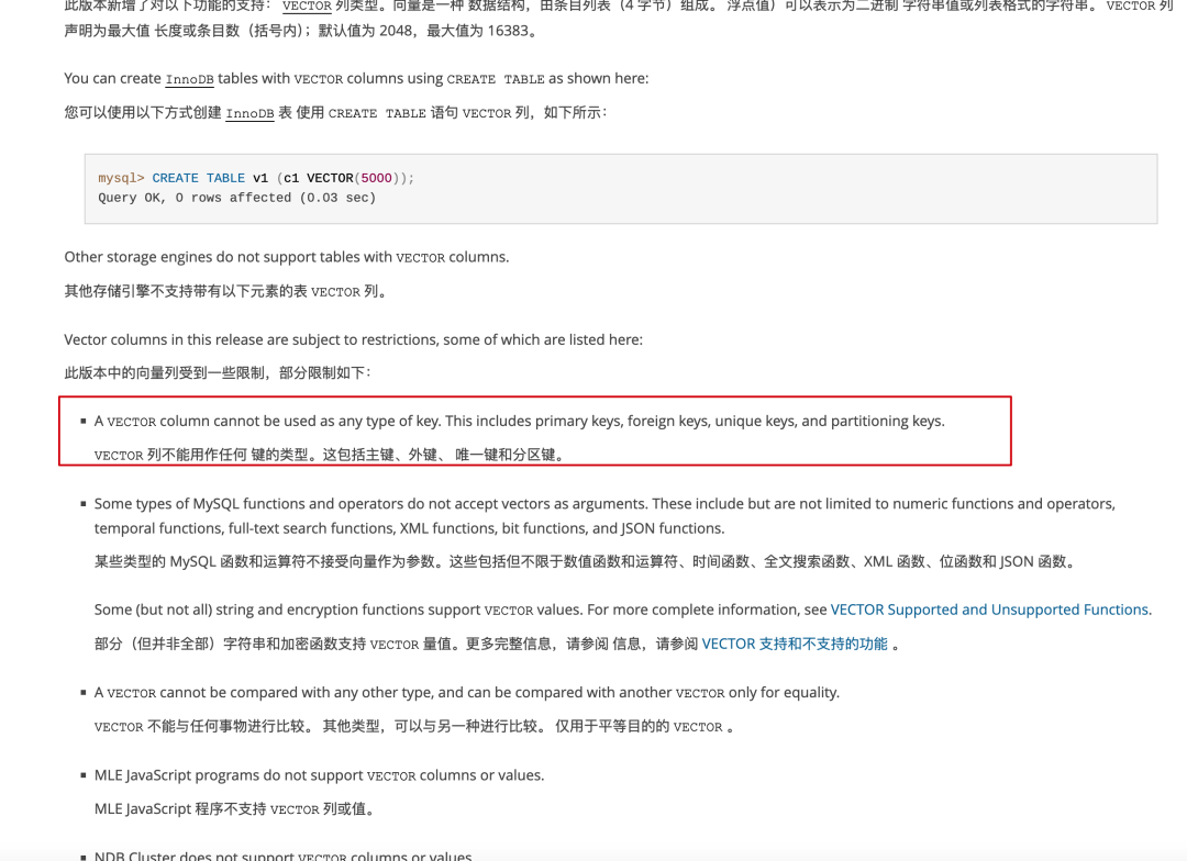 注意:MySQL 8.x 系列(包括 8.4 LTS)无官方向量支持。MySQL 9.0(2024 年 7 月发布)才正式引入 VECTOR 数据类型及 STRING_TO_VECTOR、VECTOR_TO_STRING等向量函数,但目前尚不支持向量索引(ANN),仅能做暴力计算。生态成熟度和生产验证案例远少于 pgvector。如果项目已深度绑定 MySQL 生态,可考虑 MySQL 9.0+ 基础方案(小规模)或 MySQL + 外部向量库的组合。