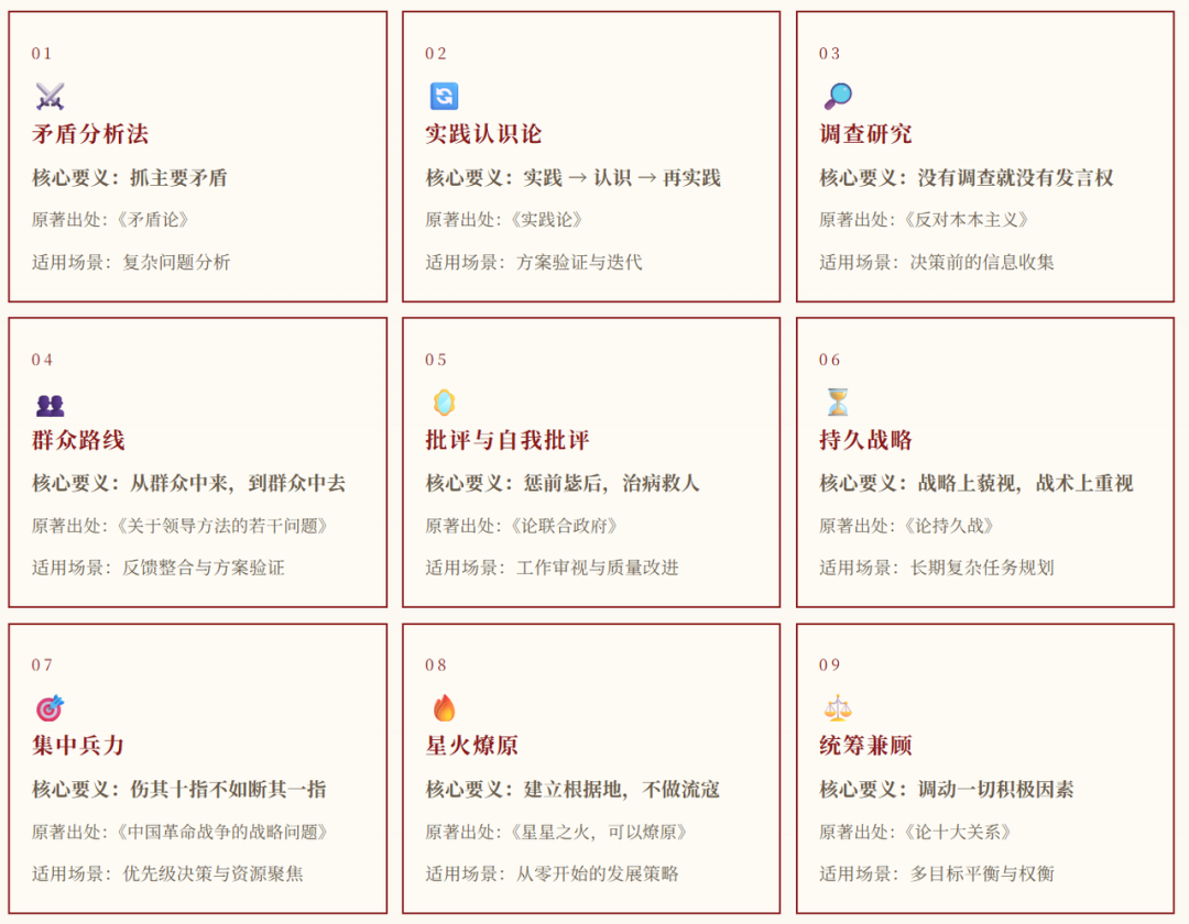 这套方法论恰好解决了这些痛点,它的信息基础是毛选(第一至五卷),