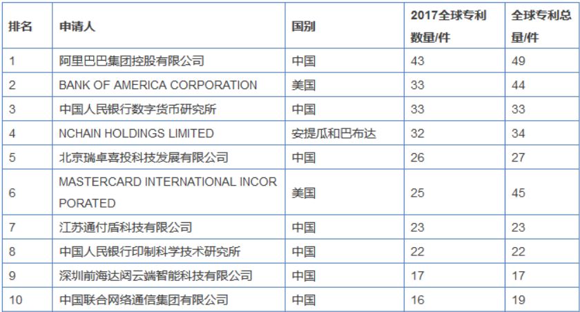 ▲2017全球区块链企业专利排行榜显示,阿里巴巴以49件专利排行全球第一