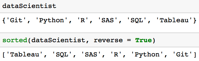 dataScientist = {'Python', 'R', 'SQL', 'Git', 'Tableau', 'SAS'}