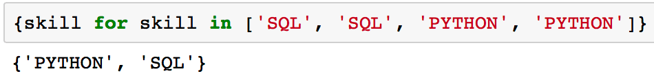 {skill for skill in ['SQL', 'SQL', 'PYTHON', 'PYTHON']}