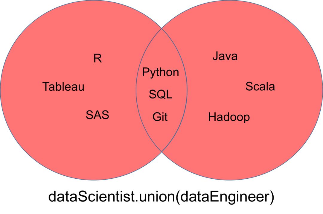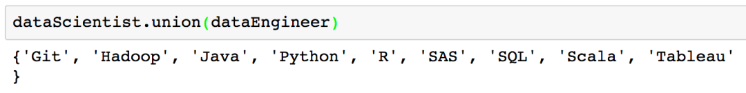 一个表示为「dataScientist ∪ dataEngineer」的并集,是属于「dataScientist」或「dataEngineer」或同时属于二者元素的集合。你可以使用「union」方法找出两个集合中所有唯一的值。