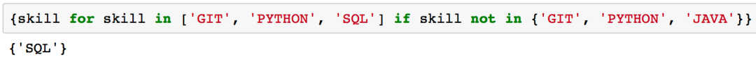 {skill for skill in ['GIT', 'PYTHON', 'SQL'] if skill not in {'GIT', 'PYTHON', 'JAVA'}}