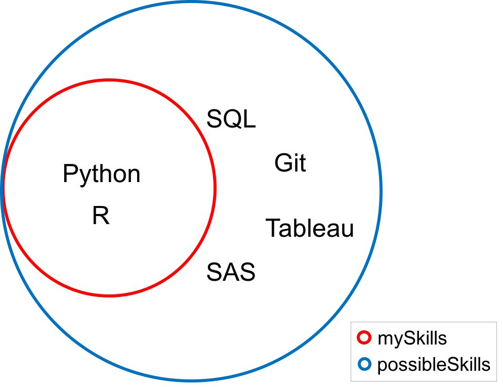 因为在这个例子中,这个方法返回的是「True」。在下面的韦恩图中,请注意「mySkills」中的每一个值同时也在集合「possibleSkills」中。