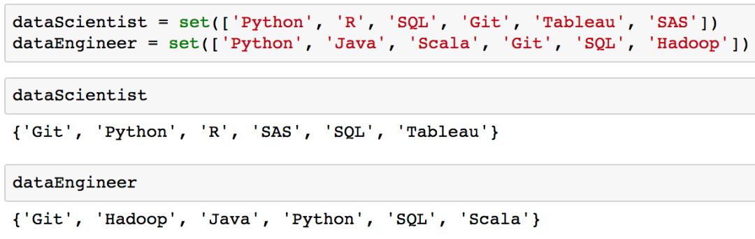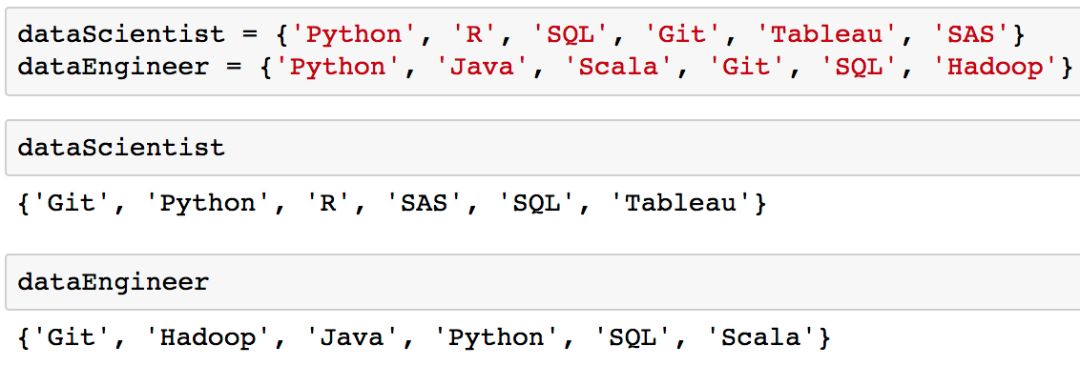 如果你观察一下上面的「dataScientist」和「dataEngineer」集合中的变量,就会发现集合中元素值的顺序与添加时的顺序是不同的,这是因为集合是无序的。