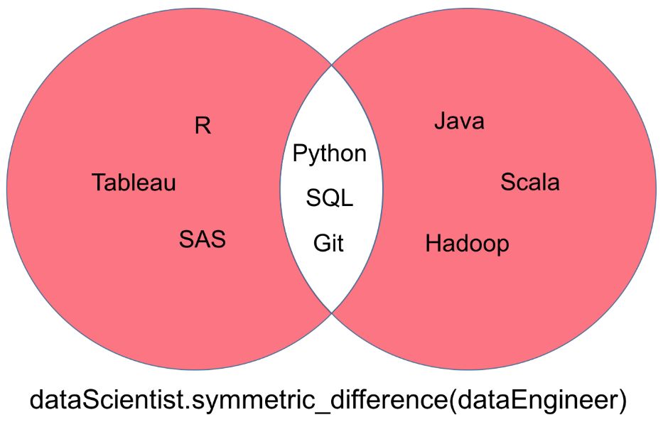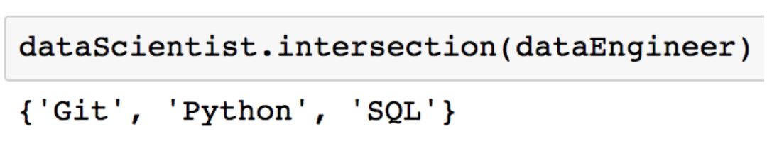 Python 集合有一些让你能够执行这些数学运算的方法,还有一些给你等价结果的运算符。在研究这些方法之前,让我们首先初始化「dataScientist」和「dataEngineer」这两个集合。
