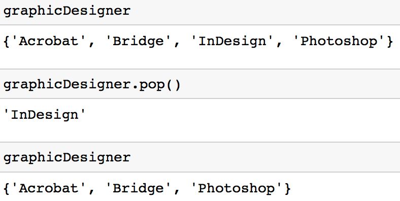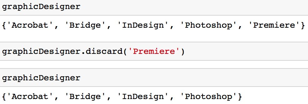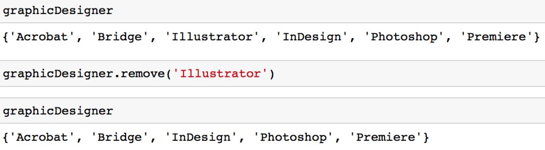 这种方法相对于「remove」方法的好处是,如果你试图删除一个集合中不存在的值,系统不会返回「KeyError」。如果你熟悉字典(dict)数据结构,你可能会发现这种方法与字典的「get」方法的工作模式相似。
